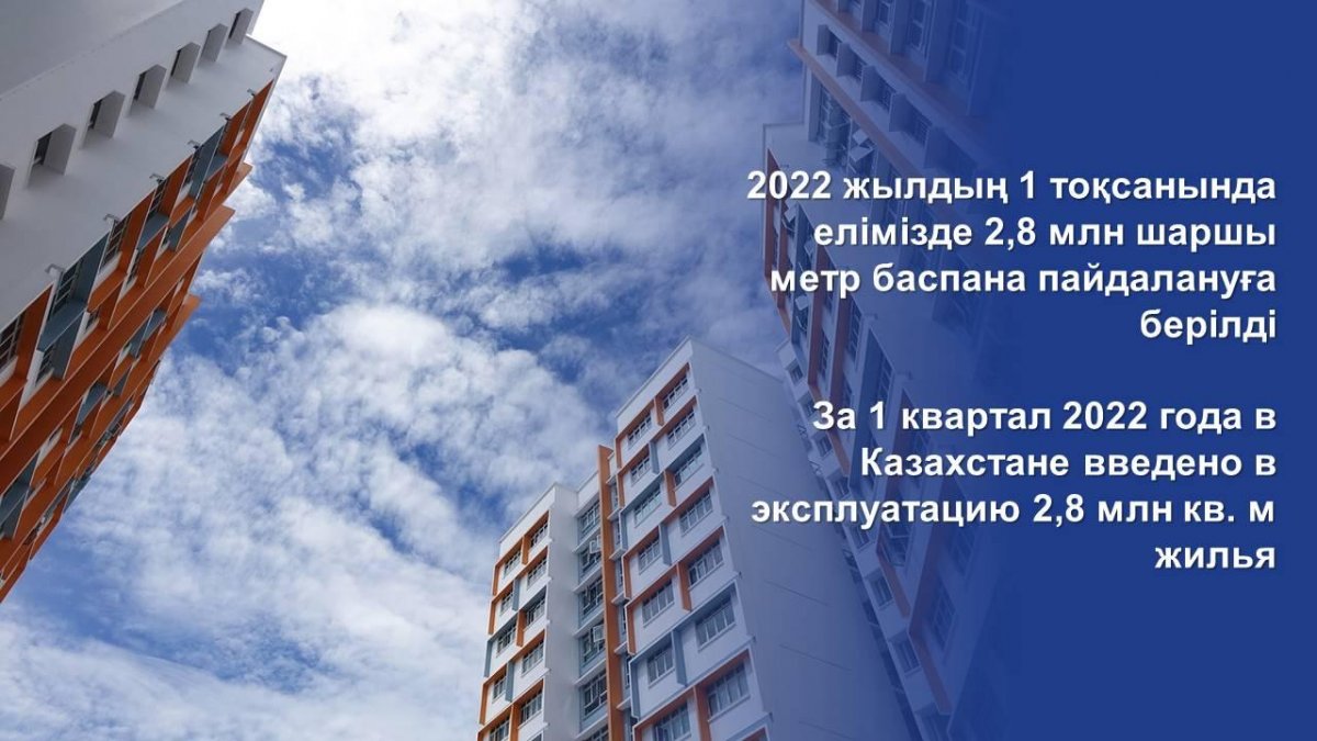 "Тұрғын үй құрылысында биыл 1 тоқсанда 2,8 млн шаршы метр баспана пайдалануға берілді. Бұл 2021 жылдың сәйкес кезеңімен салыстырғанда 100,4% құрайды. Бүгінгі таңда республика бойынша барлығы 23,3 мың үй пайдалануға берілді. 15 өңірде өсім бар. Көш басында Павлодар, Алматы, Шығыс Қазақстан, Батыс Қазақстан және Түркістан облыстары тұр. Биыл 15,1 млн шаршы метр тұрғын үй салу жоспарланған", - деді ҚР ИИДМ басшысы Үкімет отырысында.